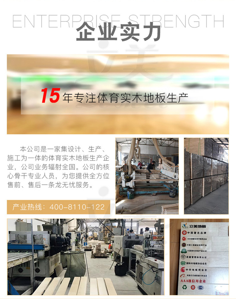 立美体育运动木地板是一家大型的运动木地板生产厂家,是集运动木地板设计、生产、研发、施工、翻新、售后服务于一体的综合性企业。公司旗下产品有各类体育木地板,其中包括篮球木地板、排球木地板、舞台木地板、健身房木地板等产品,均严格执行体育运动木地板标准进行生产。同时体育运动木地板参照德国的体育地板的DIN标准,目前在施工方面,有着多支具备十年以上施工经验的团队,可以独立承揽大型赛场馆木地板的生产与施工。